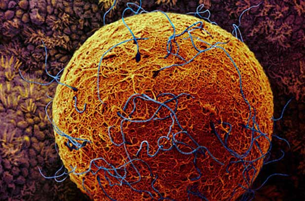 Zrela jajna ćelija ovulacijom (trenutna pojava - prskanje ili ruptura zrelog folikula koja traje između 60 i 90 sekundi) iz de Grafovog folikula dospijeva u lumen jajovoda, gdje biva opkoljena spermatozoidima koji nastoje prodrijeti u nju. Jedan od 300 do 500 spermatozoida, koji je najvitalniji prvi dolazi u kontakt sa jajnom ćelijom i uspijeva probiti spoljašnju opnu. Prelaskom “prve barijere” jedan ili veći broj spermatozoida dolazi u direktan kontakt sa “zonom pellucidom” kao sljedećom preprekom na putu do jajne ćelije. Po probijanju iste dolazi do zgušnjavanja opne koja na taj način sprečava